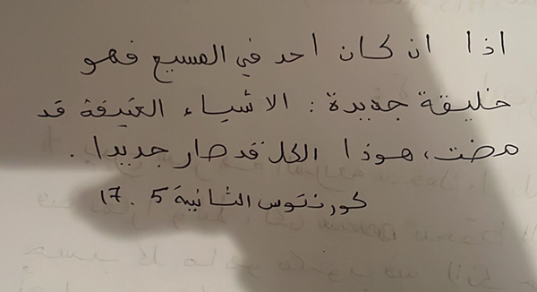 Through a set of “only God could do it” connections, we now have two English-speaking, online disciple-makers groups in Morocco in northeastern Africa. During one of those DM groups a couple weeks ago, one of the participants asked if she could write out her memory verse in Arabic! Well, sure!